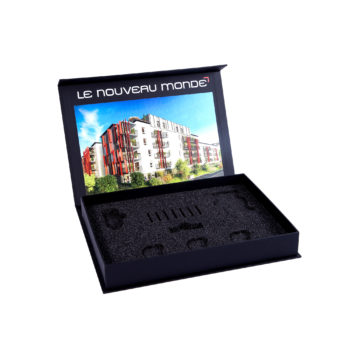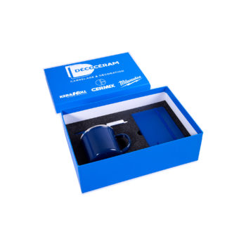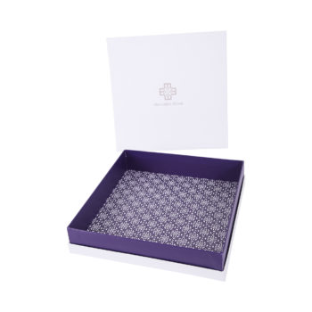 Boite cloche en carton 15.10ème un coté blanc contrecollée rembordée d’un papier création. Impression numérique du couvercle.